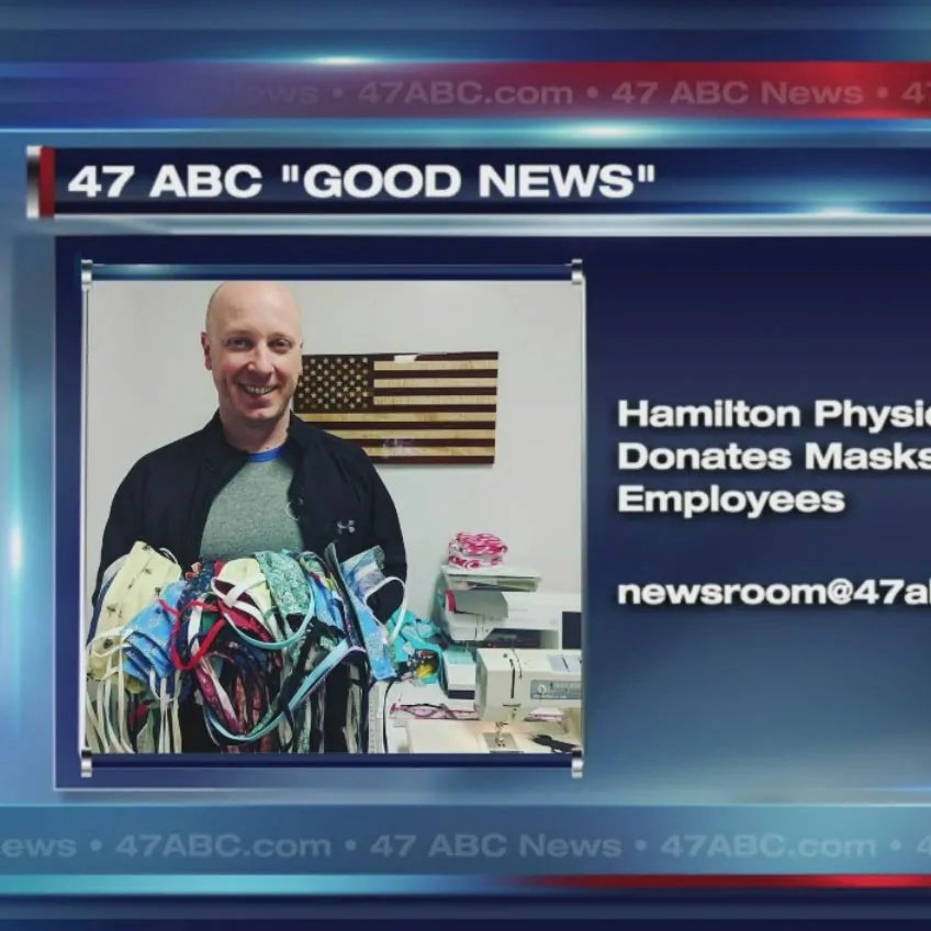 Billy Hamilton, owner of Hamilton Physical Therapy, and his mother, Carol, are recognized by 47ABC during their “Good News” segment for their donations of masks to Berlin town employees, the Berlin Police Department and other local Berlin businesses. The masks were sewn by Carol and delivered and distributed by Billy.
